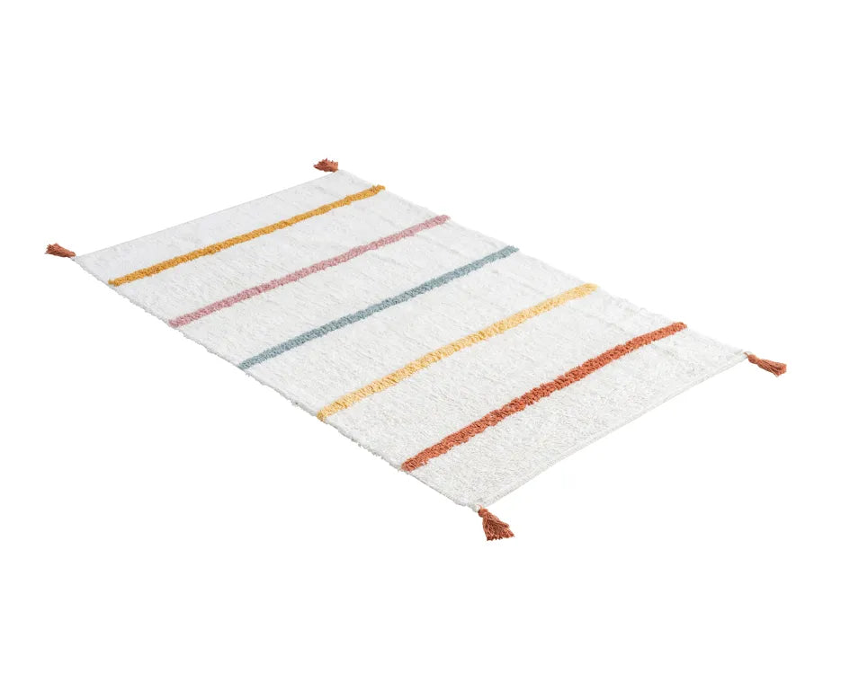 Il Tappeto a Righe Colorate è una scelta ideale per le camerette dei bambini grazie al suo design allegro, ai colori delicati e alla struttura completamente naturale. Le righe multicolore donano movimento e calore all’ambiente, creando uno spazio accogliente e sereno per il gioco e il riposo.