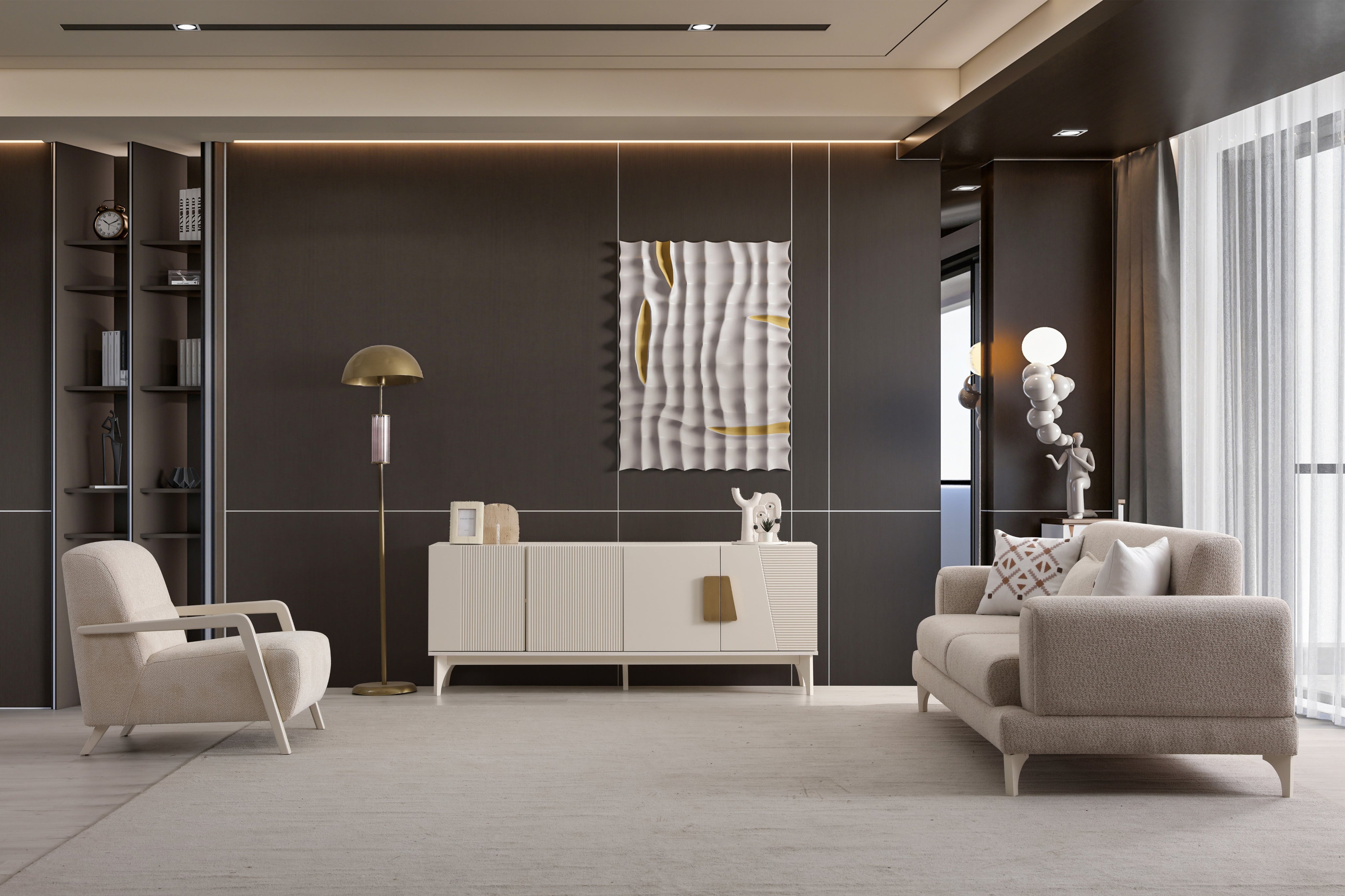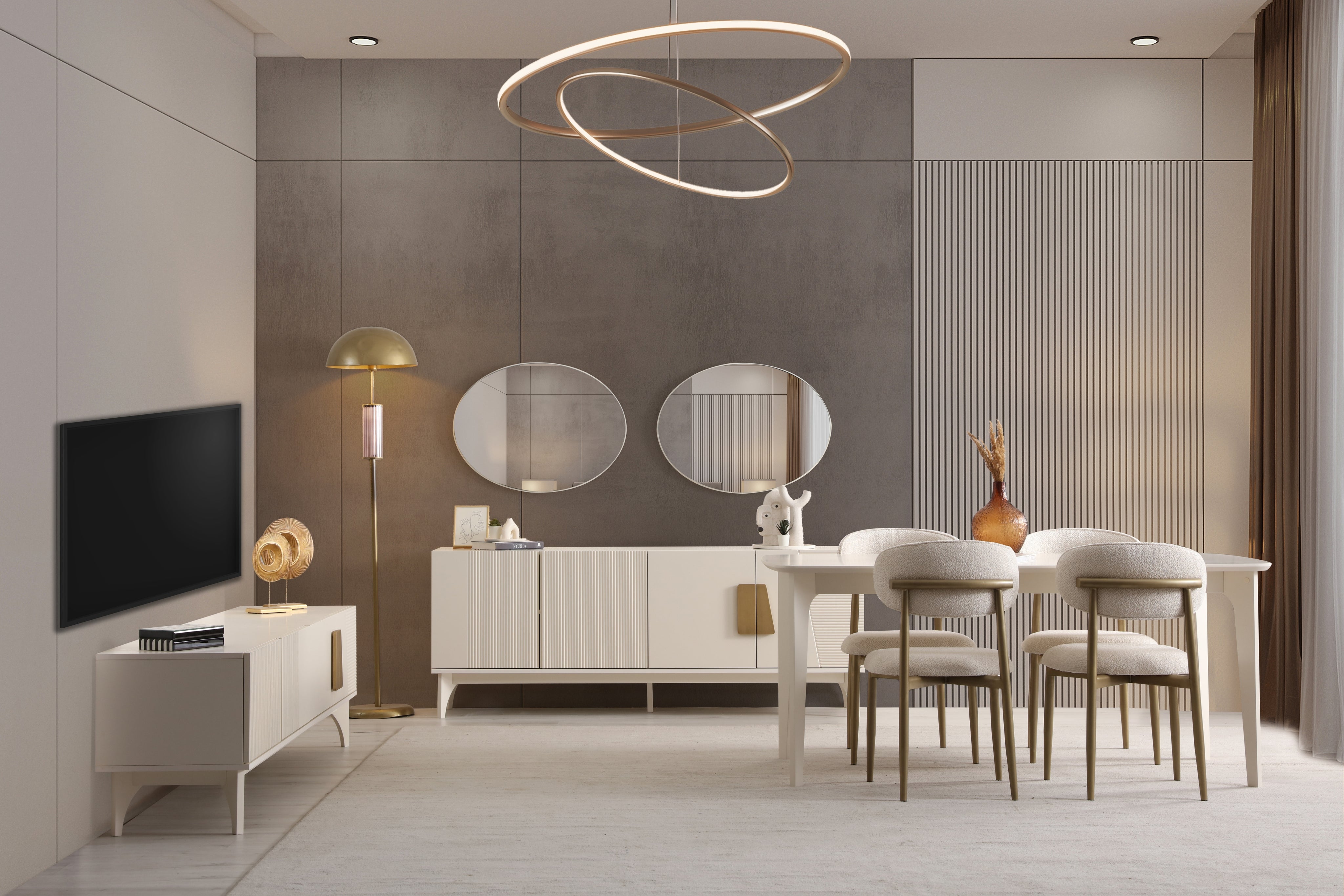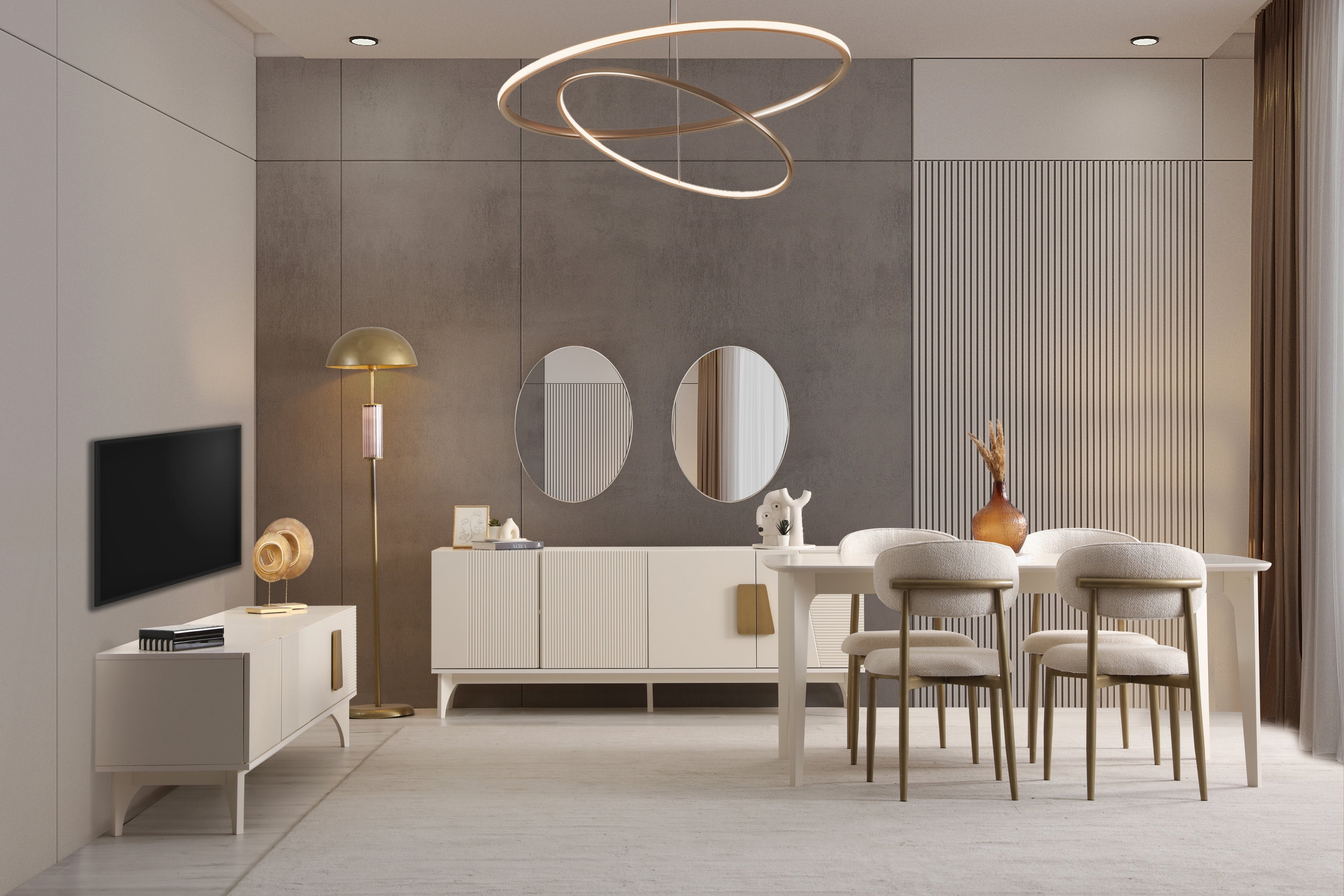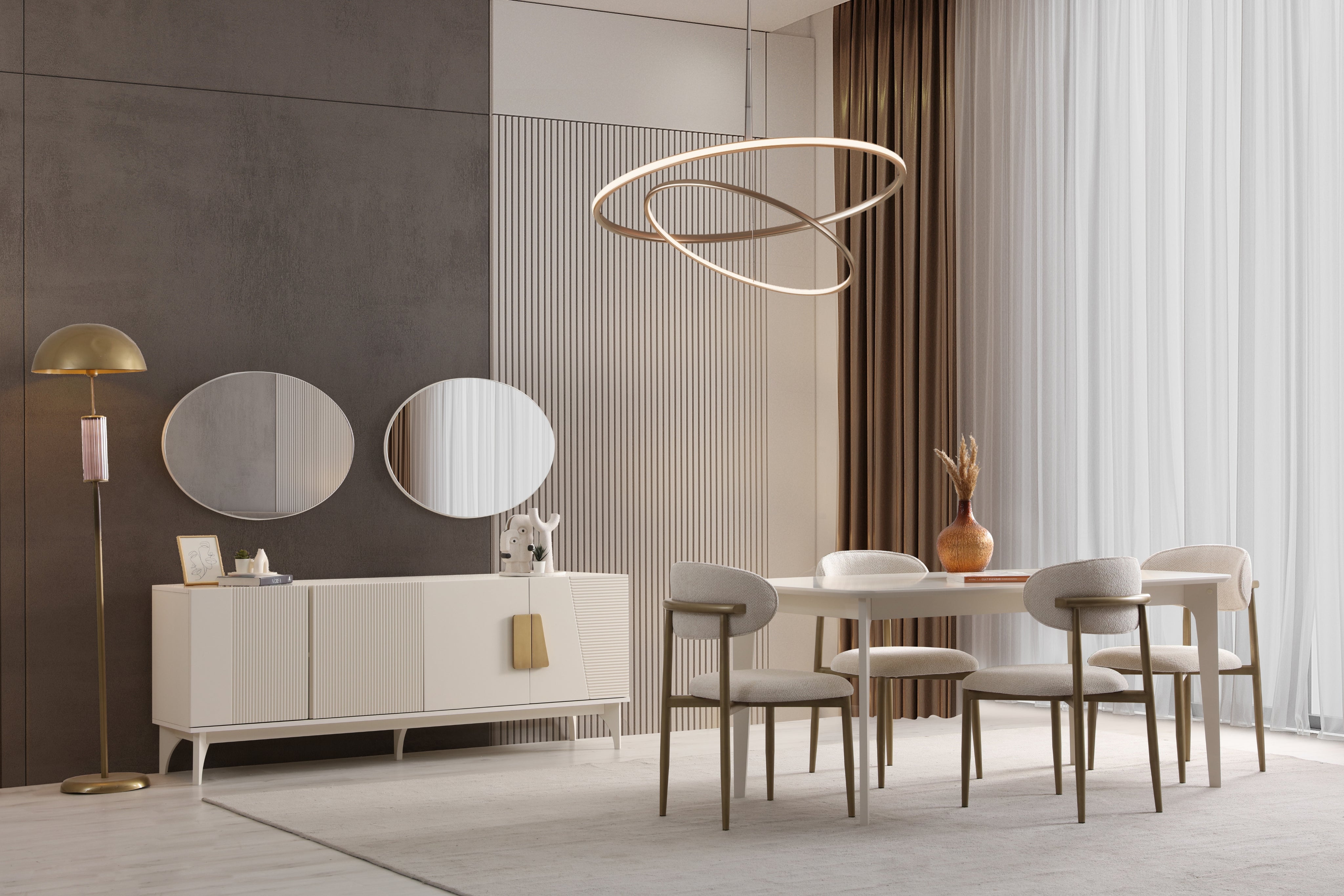 La sala da pranzo Tirilia è pensata per chi ama condividere momenti speciali in un ambiente sofisticato. Questo set completo unisce la praticità quotidiana a un'estetica di lusso moderno, caratterizzata da tonalità crema luminose, dettagli in rilievo (canneté) e accenti color oro.