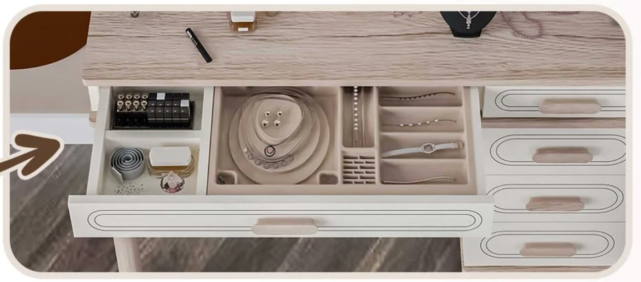 - Organizzazione Ottimale: Dotata di ampi ripiani, un pratico gancio per appendere accessori e uno speciale cassetto portagioie interno per custodire in ordine i tuoi preziosi.